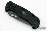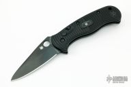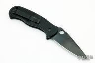 This Citadel by Spyderco features a black blade with swedge and thumb hole. Has notched thumb rest. Frame is milled and textured black aluminum with push button and safety. Clip is tip up carry, and reversible for right or left handed carry. Comes with original box and papers. Excellent condition.