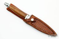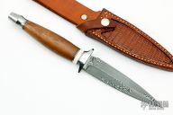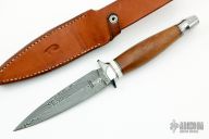 This Dagger by Rodney Rogers features a double edged Damascus blade with .157" blade stock and 1.064" blade depth, hidden tang construction. The handle has a nickel silver guard and butt with a wood grip, black/nickel silver/walrus ivory spacers. Comes with a brown leather sheath with reptile skin inlay. Has a crack in the ivory spacer, otherwise excellent condition.