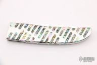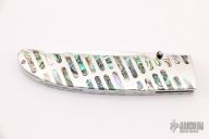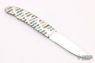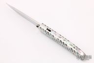 This linerlock folder from Koji Hara features a mirror polished blade and a mirror polished steel frame with abalone inlays. Black lip pearl inlay in thumb stud. Smooth action. Solid lockup, detent and blade seating. Excellent condition. Includes a stingray skin zippered case.