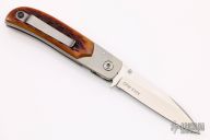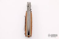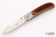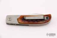 This TTF-6 linerlock folder by Bob Terzuola features a tumbled blade with a thumbstud. The handle has a bead blasted titanium frame with jigged bone scales, tip up titanium clip. Smooth action. Nice detent, lockup and blade seating. Excellent condition.