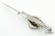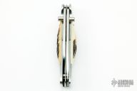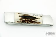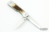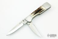 This 2-Blade Lockback by Garle features two blades with thumbstuds, two-tone mirror/satin blades. The handle has satin finished stainless steel bolsters with integral fileworked liners, stainless steel backspacers, stag inlays. Nice fit and finish, nice function and blade seating. Excellent condition. Blade reads "ATS-34SS MICH. 2000".