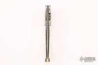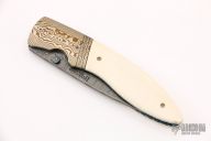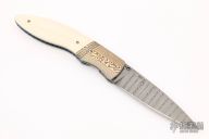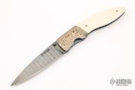 This linerlock by Bill Levengood features a Damascus blade with single thumbstud. The handle has fluted mokume bolsters, mammoth ivory scales, anodized and fileworked titanium liners, and an ivory paper micarta backspacer. Excellent condition.