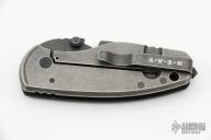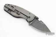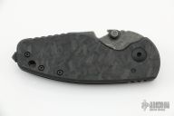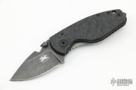 This HEAT/ F Plain Edge Framelock Folder has a black tumbled German Niolox stainless steel drop point blade with dual thumb studs, bottle opener, and a notched thumbrest. Handle is chard carbon fiber and gunmetal tumbled  titanium, with a black stainless steel tip up clip and removable glass breaker, lanyard hole. Excellent condition. Comes with original box.