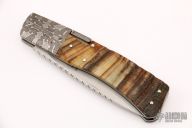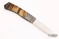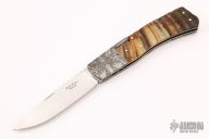 This Mid-Lock by W.D. Pease features a hand rub satin finished blade with nail nick and fileworked spine. The handle has mosaic Damascus bolsters, sheep horn scales, stainless steel liners and fileworked lockbar/backspacer. Excellent condition. "45sm20"