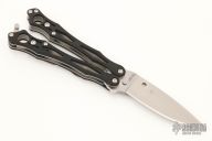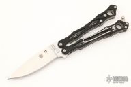 This Spyderfly 2 Balisong by Spyderco has a satin finished blade. Handle is black G10 over stainless steel liners and stainless steel paper-clip style pocket clip. Comes with original box. Excellent condition.
