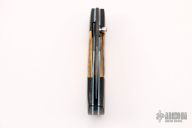 This knife by Jake Elenbaas features a clip point Alabama Damascus blade with single thumbstud with orange stone inlay. The handle has black G-10 bolsters, front and rear, mammoth ivory scales, anodized titanium liners with jeweled interiors and a black G-10 backspacer. Nice lockup and blade seating. Comes with COA. New from maker.