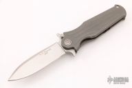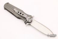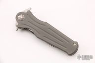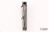 This knife by A.G. Russell features a tumbled spear point blade with a false top edge and dual notched thumbrest. The handle has a bead blasted titanium frame with a stainless steel tip down carry. Excellent Condition.
