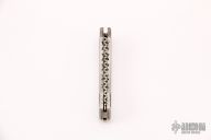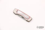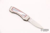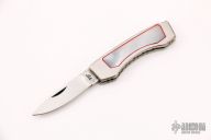 This lockback folder by Dick Akinson features a satin finished drop point blade with a fileworked blade spine.  The handle features titanium scales, fileworked steel liners/backspring and mother-of-pearl inlays.  Light scratches are visible on the handle otherwise the knife is in excellent condition.