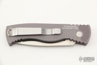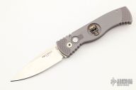 This Limited Edition TR-2.63 by Pro-Tech Knives has a satin finish blade and a gray aluminum handle inlaid with a sterling silver skull designed by Bruce Shaw. Satin stainless steel clip. Serial number 271 of 500 made. Comes with original box, sheath and papers. Excellent condition.