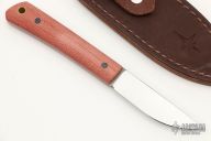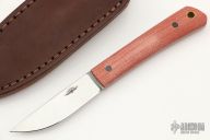This Merlin EDC by Jesse Jarosz features a satin finished blade with .130" blade stock and .695" blade depth, full tang construction with red canvas micarta scales, black linen micarta pins and brass lanyard tube. Comes with a brown leather sheath. New from maker! Classy little EDC!