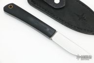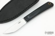 This Merlin EDC by Jesse Jarosz features a satin finished blade with .130" blade stock and .695" blade depth, full tang construction with black G-10 scales, black linen micarta pins and brass lanyard tube. Comes with a black leather sheath. New from maker! Classy little EDC!