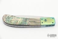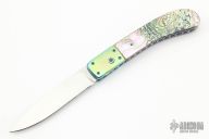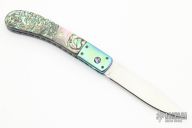 This auto from Bill King features a hand rub satin finished blade. The handle has dovetailed, orange peel finished and anodized titanium bolsters, abalone scales, anodized and fileworked titanium liners, and a stainless steel backspacer. Nice action and blade seating. Has a couple light scratches, otherwise excellent condition. This knife does not lock open. I don't know if it is intended to or not, but it does not. It doesn't look like the plunge lock doesn't even attempt to lock it. So maybe it wasn't intended to lock, I don't know.