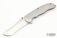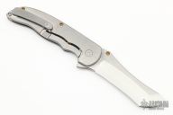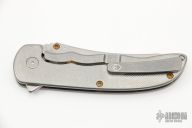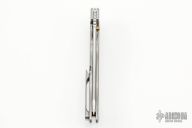 This Norseman (#2782) by John Grimsmo features a tumbled blade with a single titanium thumb stud, notched thumb ramp and flipper. The handle features tumble crosshatch textured titanium frame with titanium screws. Very smooth action that requires no wrist movement. Nice detent, lockup and blade seating. Rides on ceramic bearings. Knife is in excellent condition, shows no signs of use or carry. Comes with original custom hard case, Nano-Oil, tool, and COA dated Sept. 18, 2019.