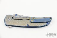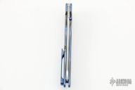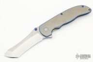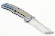 This Norseman (#2828) by John Grimsmo features a tumbled blade with a single titanium thumb stud, notched thumb ramp and flipper. The handle features tumble and two tone anodize finish crosshatch textured titanium frame with titanium screws. Very smooth action that requires no wrist movement. Nice detent, lockup and blade seating. Rides on ceramic bearings. Knife is in excellent condition, shows no signs of use or carry. Comes with original custom hard case, Nano-Oil, tool, and COA dated Sept. 26, 2019.