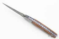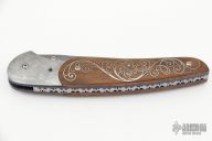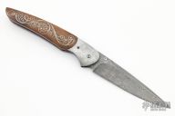This linerlock by ZRP  features a Damascus blade with single thumbstud with black something inlay. The handle has Damascus bolsters, walnut scales with intricate silver wire inlays, anodized titanium liners, fileworked stainless steel backspacer. Nice detent, lockup and blade seating. Excellent condition.