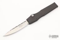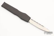 This HALO II is the clip point blade model in the HALO series by Microtech Knives. Single action, side positioned button for firing. Closure via a reverse charging handle in the rear of the frame. Contoured frame grip with milled ribbing on the frame spine and belly. This Halo II has a tumbled clip point blade. Dated 08/2002. Includes the original box, papers and nylon sheath.  Excellent Condition.