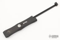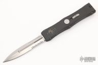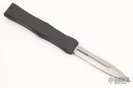 This Nemesis OTF automatic by Microtech opens via the automatic push button. Closes by disengaging the leaf lock and pulling the reverse charging handle in the rear of the frame. Contoured frame grip with milled ribbing on the frame spine and belly. S/N 756 and dated 4/99. Brend hand rub satin finished double-edged partially serrated blade.  Includes the original box and papers.  Excellent Condition.