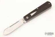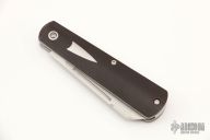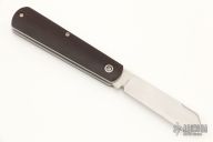 This Barlow slipjoint by Enrique Pena features a hand rub satin finish blade with swedge, and long pull nail nick. The handle has brown canvas micarta covers over gray liners, titanium liners. Stainless steel shield, collar, and spring.  Includes padded and zippered case. Excellent condition.