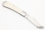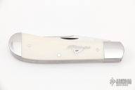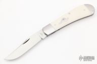This Trapper by Andy Fannin features a satin finished blade with nail nick. The handle has white G10 covers, stainless steel front and rear bolsters, liners, mustang escutcheon, and spring. Has half-stop, flush in all positions. Comes with a zipper case. Has a few light scratches, otherwise excellent condition.