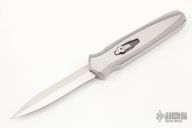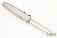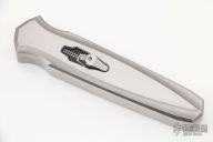 This Triton II OTF Auto by Jeffrey Harkins features a hand rub satin finished double edged blade. The handle has a two tone 416 stainless steel frame with bead blast finished bevels and millings, satin flats, milled stainless steel thumbslide with a 2mm sapphire inset. Excellent work. Comes with  hard-case and provenance papers dated March 1, 2017. Has some light scratches, otherwise excellent condition.