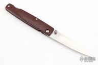 This Spike by the Late Phil Boguszewski features a satin finished blade with nail nick and dual checkered thumbstuds. The handle has a red linen micarta frame with stainless steel spring/backspacer. Nice lockup and blade seating. Excellent condition.