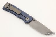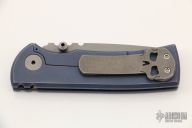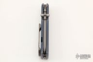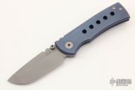This Chaves American Made Knives Redencion 228 is a framelock folder based on the popular Redencion custom knife made by Ramon Chaves. This piece features a tumbled and bead blasted blade with notched thumbrest and dual thumbstuds. The handle is comprised of anodized, tumbled and drilled titanium scales over titanium barrel spacers. Matching signature "Chaves Skull" tip up clip. Lanyard pin in pommel. Has a few scuffs, otherwise excellent condition.