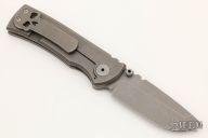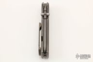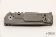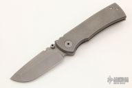 This Chaves American Made Knives Redencion 228 is a framelock folder based on the popular Redencion custom knife made by Ramon Chaves. This piece features a tumbled and bead blasted blade with notched thumbrest and dual thumbstuds. The handle is comprised of tumbled titanium scales over titanium barrel spacers. Matching signature "Chaves Skull" tip up clip. Lanyard pin in pommel. Has a few scuffs, otherwise excellent condition.