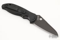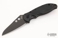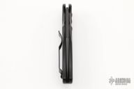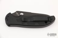 This Embassy by Spyderco features a black blade with swedge and thumbhole. Has notched thumb rest. Frame is milled and textured black aluminum with push button and safety. Clip is tip up carry, and reversible for right or left-handed carry. Excellent condition.