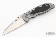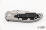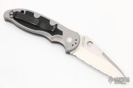 This Embassy from Spyderco features a clip point style blade with swedge, small thumb hole and notched thumb ramp. The handle has an aluminum frame with black G10 inlays. Lanyard hole in pommel. Reversible black coated stainless steel tip up clip. Blade is deployed via push button with fast coil spring action. Sliding safety on "A" side of handle. Scratches are visible on the pocket clip otherwise the knife is Excellent condition.
