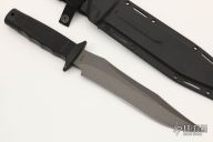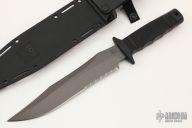 This Tigershark from SOG Knives features a black coated clip point partially serrated blade with sedge .255" blade stock and 1.745" blade depth. The handle is comprised of a rubberized grip over hidden tang construction. Lanyard hole in pommel. Includes kydex sheath with belt loop. Has a scuff on the blade from the sheath, otherwise excellent condition.