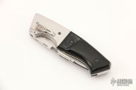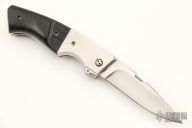 This small side-opening automatic by Jose DeBraga features a hand rub satin finished blade with textured ricasso and false top edge. The handle has carved and selectively satin finish titanium scales, textured/fileworked/polished stainless steel backspacer. Dovetail bolsters, carved G10 scales. Has a stepped release mechanism. Very unique. Comes with a zipper case. Has a couple light scratches, otherwise excellent condition.