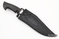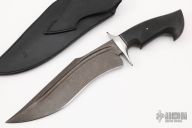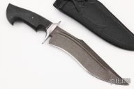 Another absolutely stunning piece from the Sobral brothers! This Volcano features a recurve blade with a forced patina finish, false top edge and deep fullers, .290" blade stock and 2.293" blade depth, hidden tang construction. The guard is stainless steel with a black canvas micarta grip, nickel silver and micarta spacers. This piece comes in an equally impressive, hand tooled, black leather sheath and a leather zippered case. Excellent condition.