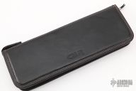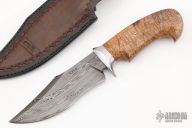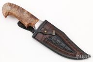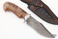 Another absolutely stunning piece from the Sobral brothers! This fighter/bowie features a recurve blade that has been crafted from Random Pattern Damascus, the top edge is not sharpened, .234" blade stock and 1.793" blade depth, hidden tang construction. The guard is stainless steel with a beautiful mango wood grip that has been masterfully shaped/contoured to fit the hand, single domed pin. This piece comes in an equally impressive, hand tooled, black/brown leather sheath and a leather zippered case. Excellent condition.