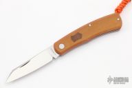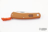 This Native Slipjoint by Jared Oeser features a satin finished blade with nail nick. The handle has vintage yellow linen covers over orange and natural liners, stainless steel liners and spring. Micarta escutcheon and lanyard bail at the base. Comes with original box, handkerchief, and COA dated 9/17/20. Excellent condition.