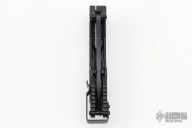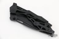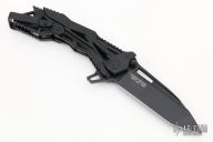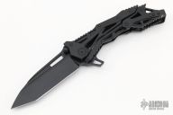 This QTR-11 from Quartermaster Knives features a black tanto blade with satin flats, dual thumb studs, notched thumb rest and flipper. The handle has a black finished titanium, black stainless steel tip up clip. This knife is a G&G Hawk design. Includes original box and papers dated 2-17-16 and #195/300. Excellent condition.