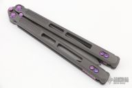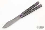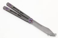 This Trident Balisong by Elite Outfitting Solutions features a bead blasted blade with fullers.  The handle features a bead blasted titanium frame anodized titanium hardware.  Includes a matching T-latch that is not attached.  Comes with original box. Excellent condition.
