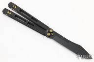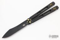 This Trident Balisong by Elite Outfitting Solutions features a black blade with fullers.  The handle features a black titanium frame anodized titanium hardware.  Includes a matching T-latch that is not attached.  Comes with original box. Excellent condition.