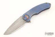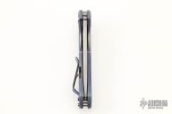 This F3 Retro by Curtiss Knives features a dark stonewashed blade with notched thumbrest and flipper. Anodized and tumbled titanium frame over standoffs with a matching titanium tip up clip. Smooth and fast opening using a Caged Bearing System. Nice blade seating, detent and lock up. Includes padded and zippered case and COA dated 6-24-20. Has scuffs and scratches, otherwise good condition.