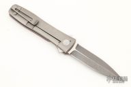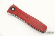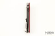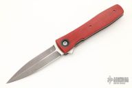 This Model 31 Flipper by Jason Clark features a double edged blade with a notched flipper. The handle has a red paper micarta scale with black paper micarta pivot collar, bead blasted titanium frame, floating stainless steel backspacer, tip up titanium clip. Rides on IKBS, nice detent, lockup and blade seating. Comes with a leather slip sheath and COA. Has a few light scuffs, otherwise excellent condition.