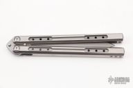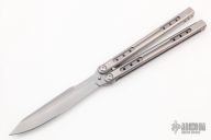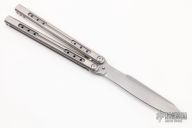 The Heibel Sapient Balisong features a RWL34 blade with a bead blast finish.  The handles are anodized 6AL-4V titanium with a latchless channel design, bushings, phosphor-bronze washers, and tang pins.  S/N 047.  Includes original box and COA.  Excellent Condition.