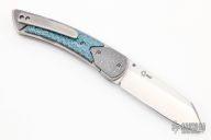 The Model 10 XL by Les Voorhies features a satin finished blade with single thumbstud. The handle has Damascus bolsters, green twill scales, satin titanium liners, floating Damascus backspacer, tip up titanium clip. Blade is centered when closed, smooth action, nice detent and lockup. On caged bearings. Comes with a zippered case, a set of anodized titanium scales with go with the currently installed bolsters, a set of carbon fiber scales and backspacer, two extra tip up titanium clips and screws. Excellent condition.