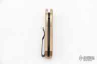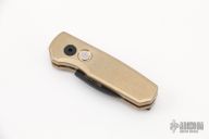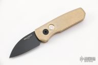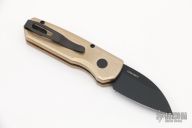 This Runt by Pro-Tech features a black blade.  The handle features a stonewashed bronze aluminum frame with milled thumbrest, a stainless steel tip up pocket clip and a mother-of-pearl push button.  Comes with original box and papers. New from maker.
