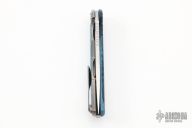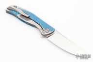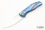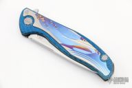 This knife is a collaboration between Shirogorov and Chris Reeve Knives, it features a tumbled blade with satin finished flats, notched thumbrest and flipper. The handle has Aquamarine alutex front scale with a titanium overlay with a unique graphic, titanium lockside with Aquamarina alutex inlay, tip up titanium clip with hidden screws, titanium backspacer. Comes with original box and papers. Excellent Condition.
