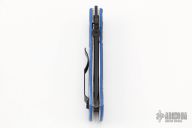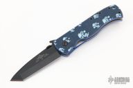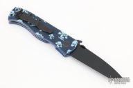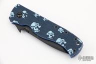 This CQC-7 by Emerson Knives has a black tanto chisel ground blade with notched thumbrest, wave features and thumbdisc. Has "Glow Skull" G-10 scales with blue G-10 liners, titanium liners, and a tip up black stainless clip. S/N 12750. Nice detent, lockup and blade seating. Includes original box. Excellent condition.