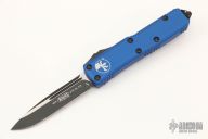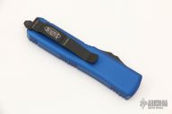 This UTX-85 by Microtech features a black finished blade. The handle has a blue aluminum frame with black hardware and tip down clip. Comes with original box and papers. Dated 03/2021 and s/n 63690. Excellent condition.