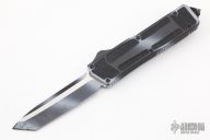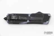 This Scarab OTF automatic has a black and satin tanto blade with fully serrated edge and a black aluminum handle with nonslip inserts. Urban Camo finish. Stainless steel clip, tip down carry. Glass breaker.  Solid quick action. Dated 10/05; Serial 00293. Has scuffs, scratches, has been used. Fair condition. Good functioning user.
