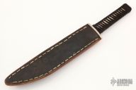 This tanto by Shiva Ki features a tanto blade with hamon, .164" blade stock and 1.098" blade depth, hidden tang construction. The handle has a nickel silver guard, wrapped grip over white stingray skin. Comes with a brown leather sheath with clip. Has some light scratches and patina, otherwise excellent condition.