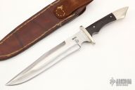 This Mercenary from Shiva Ki features a recurve double edge blade with visible temper line, .233" blade stock and 1.523" blade depth, full tang construction. The handle is comprised of a nickel silver guard and rear bolsters with ironwood burl scales. Includes a brown leather sheath with belt loop. Has some oxidation spots, otherwise excellent condition.