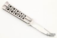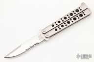 This is a Model 30 Bali-Song with a partially serrated blade and swedge. The handles are stainless steel with a T-latch. Comes with original sheath. Has scratches, and a blunted tip. Marring on the T-latch. Good condition otherwise.