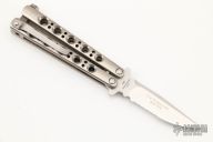 This model 31S balisong by Benchmade features a stonewashed, partially serrated clip point blade with a false top edge. Has titanium handles with a stainless steel clip, tip up carry. This is a numbered pre production run (003/500) Includes original box and paperwork. Has a few light scratches, otherwise excellent condition.